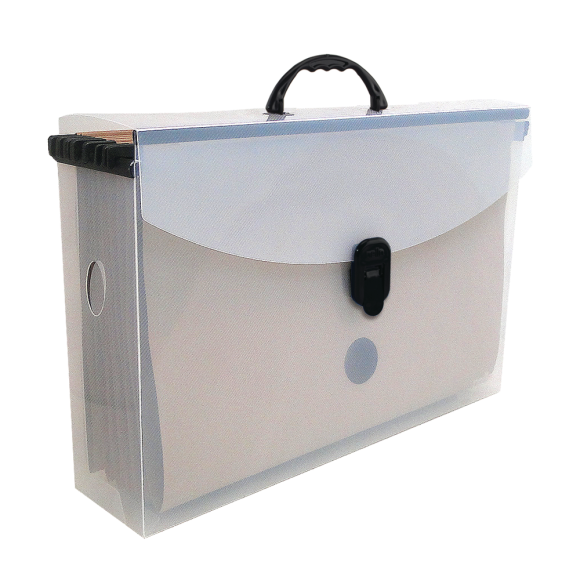 Maleta em polipropileno com 06 pastas suspensas kraft. Acompanha grampo plástico, visor e etiqueta.