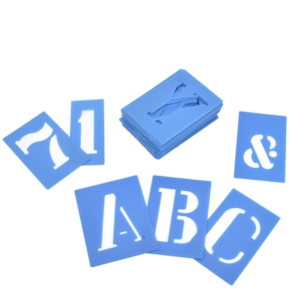 Letras e números vazados de plástico “PP” na cor azul / Medidas: 75mm / Contém 36 letras e números vazados.