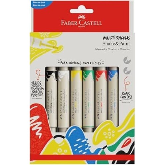 Especificação: Marcador Multisuperfície MultiMark Faber-Castell: 2 em 1 / Duas pontas em um único produto / Base: Água / Ponta de 1.0 mm para contornos e traços finos e ponta de 3.0 mm ideal para preenchimento e traços grossos / Excelente cobertura nas mais diversas superfícies: papel, cartão, madeira, plástico, vidro, metal, cerâmica, parede e muito mais / O marcador é permanente em superfícies porosas e pode ser removido em vidro ou superfícies lisas / Tinta não lavável em tecidos / Embalagem com 6 cores clássicas.