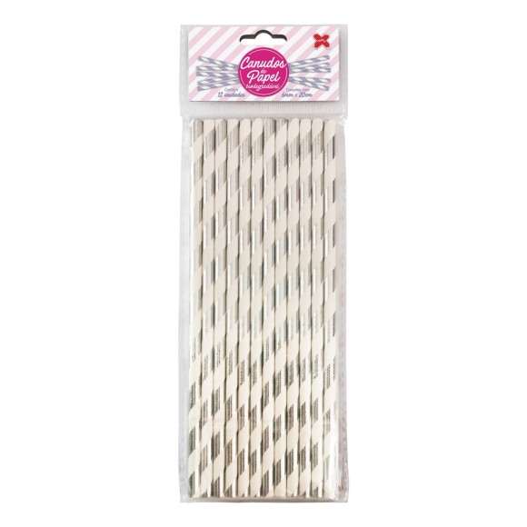 Canudo de papel biodegradável Listrado – Prata Metalizado / Medidas: 6mm x 200mm / Embalagem com 12 unidades.