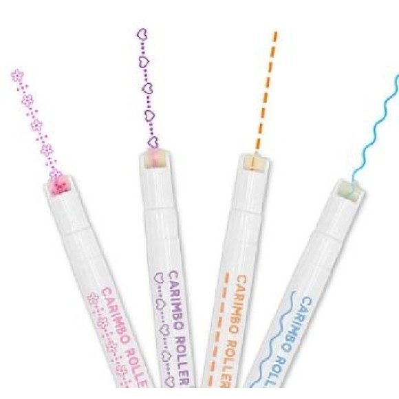O Carimbo Roller Lunix tem formato de caneta, com tinta à base de água, nas opções de estampas de corações lilás, flores rosa, tracejados laranjas e ondas azuis.