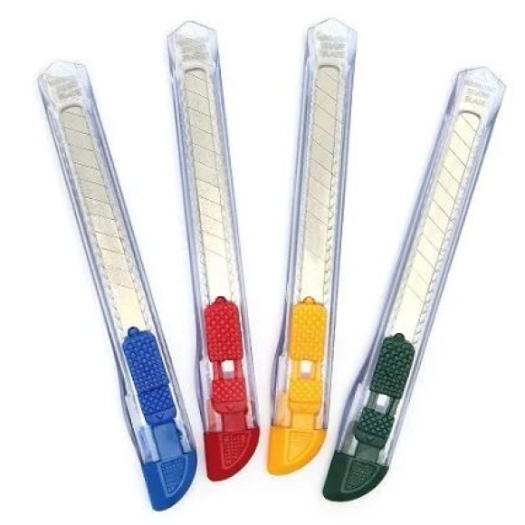 Estilete plástico estreito / Comprimento: 150mm / Lâmina: 9mm / Com trava de segurança / Cores sortidas / Venda por unidade