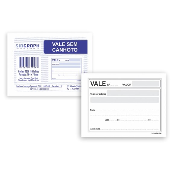 Detalhes: Vale sem canhoto / Formato: 104mm x 78mm / Gramatura: 56g/m² / 50 Folhas